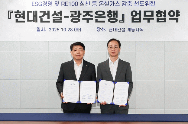 광주은행은 현대건설과 ‘ESG경영 및 RE100 실천 등 온실가스 감축 선도 위한 업무협약’을 체결했다고 29일 밝혔다. 협약식은 현대건설 본사에서 정일선 광주은행 부행장과 이동훈 현대건설 상무 및 관계자들이 참석한 가운데 진행됐다.