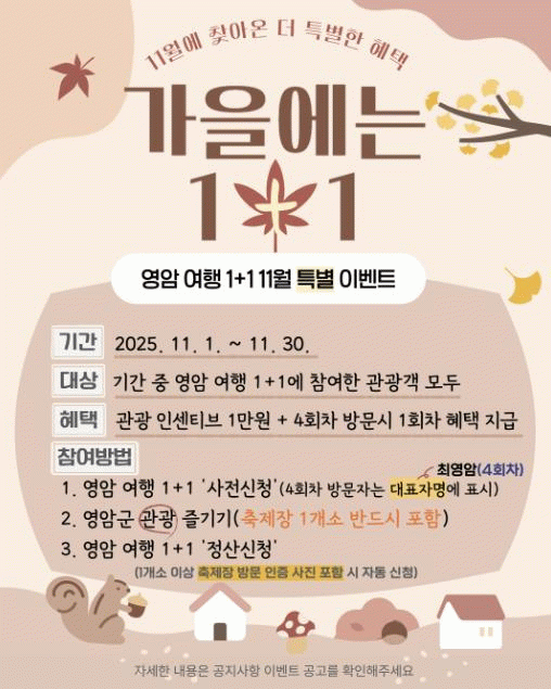 우승희 영암군수는 “국화향 가득한 월출산에서 가족과 연인, 친구가 함께 스탬프 투어를 즐기고, 영암여행 1+1 혜택과 함께 반복해서 즐기는 여행의 기쁨을 영암에서 누려보길 바란다”고 추천했다.