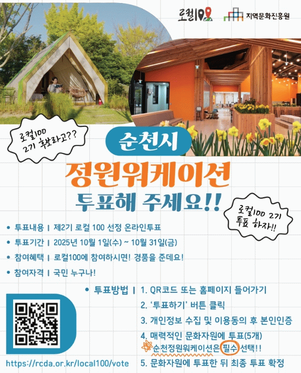 시 관계자는 “올해 총 1,042곳의 추천지 중 빅데이터 분석과 지역 심사를 통해 200개의 후보군이 선정됐는데, 그중 순천 정원워케이션이 이름을 올렸다”며, “독창적인 매력을 인정받아 매우 뜻깊게 생각한다. 제2기 로컬 100에 선정될 수 있도록 많은 관심과 응원 부탁드린다”고 말했다.