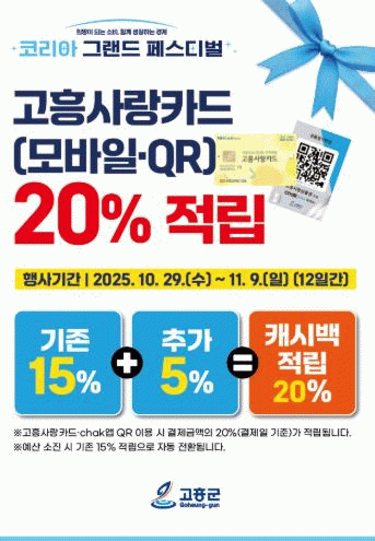 고흥군은 전국적으로 진행되는 코리아 그랜드 페스티벌에 발맞춰 지역 소비 및 상권 활성화를 위해 모바일 고흥사랑상품권 적립률을 5% 상향해 총 20% 특별 적립 이벤트를 마련했다.