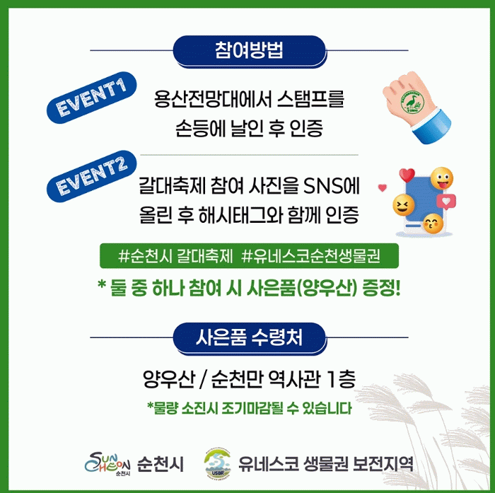 두 번째는 순천만갈대축제 현장에서 촬영한 사진을 #순천만갈대축제, #유네스코순천생물권 등의 해시태그와 함께 개인 SNS에 게시 후 순천만 역사관에서 인증하면 된다.