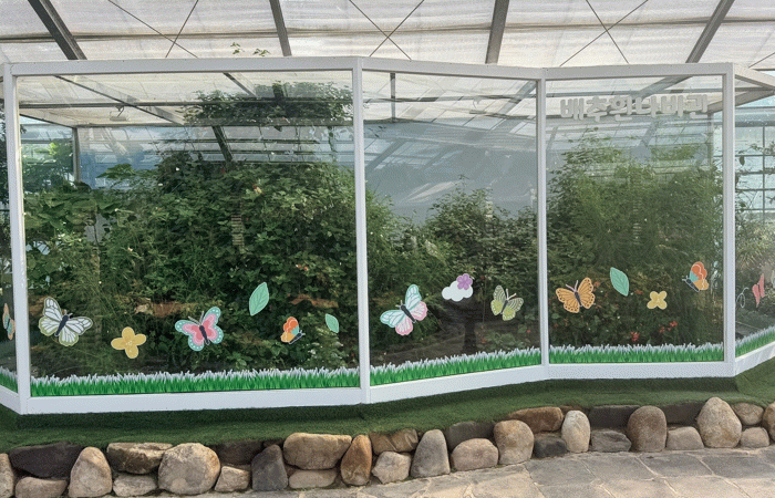 전시관에는 배추흰나비, 큰줄흰나비 등 다양한 국내 자생종이 전시되어 있으며, 관람객들은 온실 안에서 꽃 사이를 자유롭게 날아다니는 나비의 생생한 비행 모습을 가까이에서 즐길 수 있다.