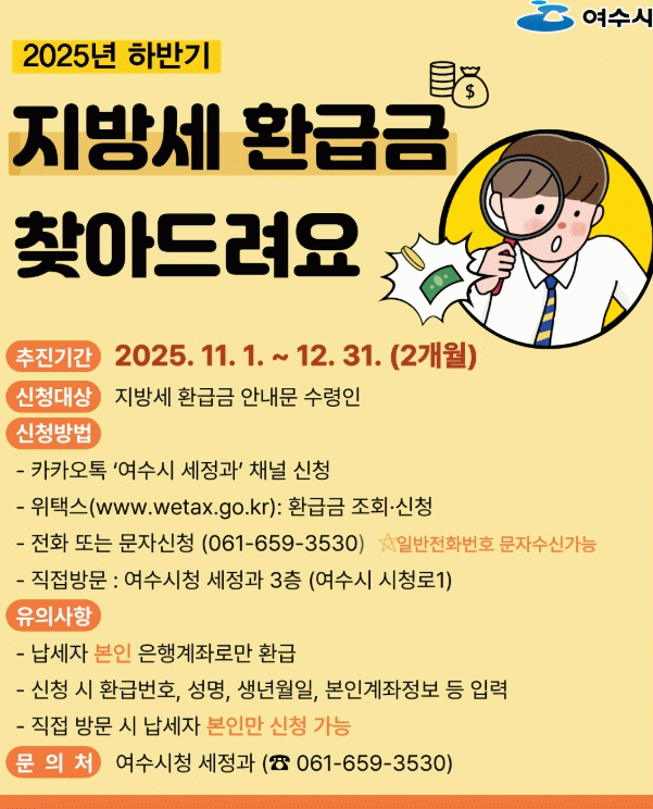 환급은 카카오톡 채널(‘여수시 세정과’) 또는 위택스를 통해 온라인으로 신청 가능하며 전화·문자 신청, 여수시 세정과 본인 방문 신청(신분증 지참)도 가능하다.