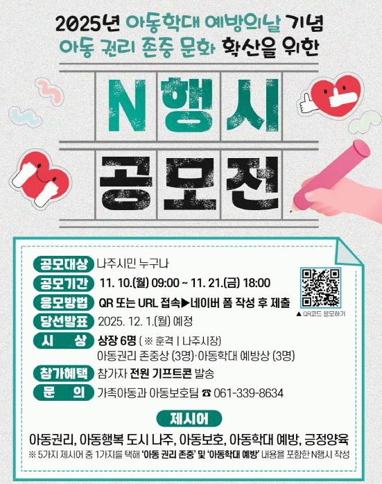 나주시 관계자는 “시민이 직접 참여해 아동의 권리와 학대 예방의 중요성을 함께 생각하는 의미 있는 공모전이 될 것으로 기대한다”고 밝혔다.