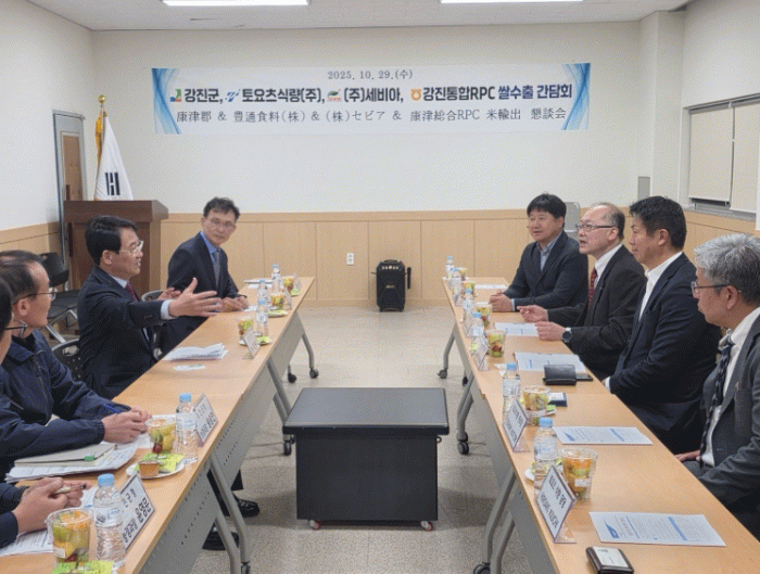 지난달 29일 강진군 통합RPC(강진군농협쌀조합공동사업법인)에서 ㈜토요츠 식량, ㈜세비아 관계자들과 강진군 통합RPC 임직원 등이 참석한 가운데 ‘강진쌀 수출 협력 간담회’가 열렸다.