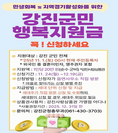강진군 군민행복지원금은 오는 11월 24일부터 12월 19일까지 지급된다. 군민 1인당 20만 원씩 전액 지류형 강진사랑상품권으로 지급되며 온라인 신청 및 지급은 하지 않는다.