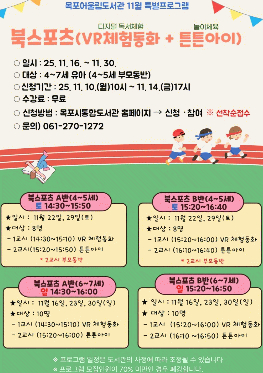 참여 신청은 오는 11월 10일부터 14일까지 목포시통합도서관 누리집을 통해 4세부터 7세까지의 유아를 대상으로 무료로 접수받는다.
