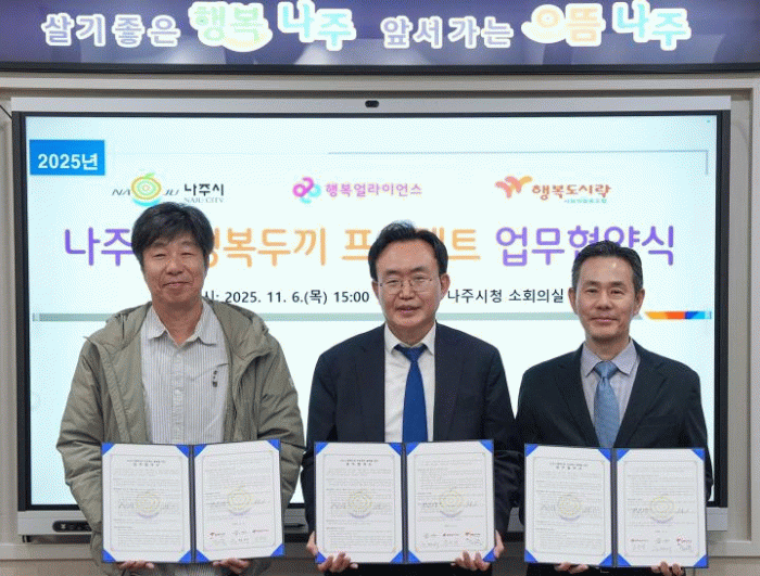 이날 협약식에는 윤병태 나주시장을 비롯해 조민영 행복나래㈜ 본부장, 최준 행복도시락사회적협동조합 사무국장이 참석했다.