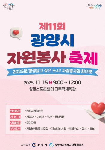 ‘광양시 자원봉사 축제’는 한 해 동안 지역사회 발전을 위해 헌신한 자원봉사자들을 격려하고, 시민 모두가 함께 나눔의 가치를 공유하는 축제의 장이다.