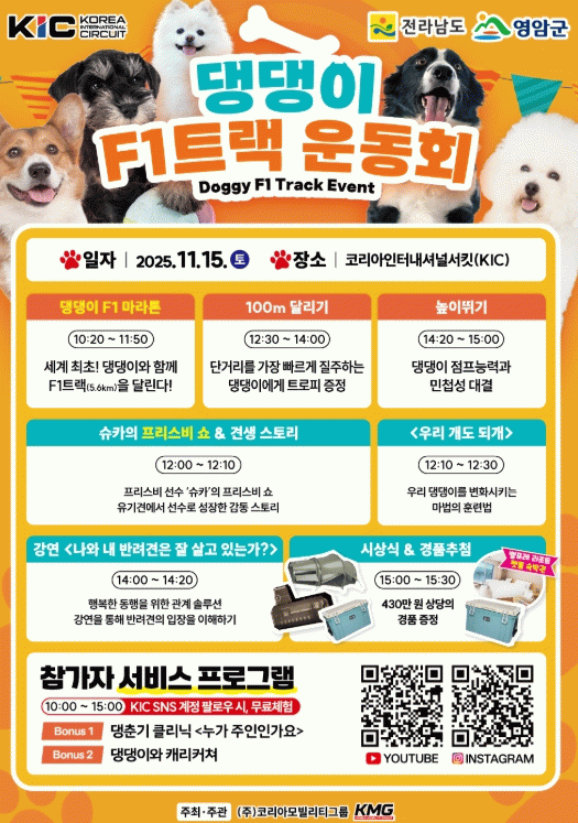 성정민 ㈜코리아모빌리티그룹 대표는 “이번 대회는 세계적 수준의 F1서킷을 배경으로 반려가족이 함께 즐기는 참여형 문화축제”라며 “모터스포츠를 넘어 가족과 반려동물이 함께 즐길 복합 문화공간으로 탈바꿈하겠다”고 말했다.