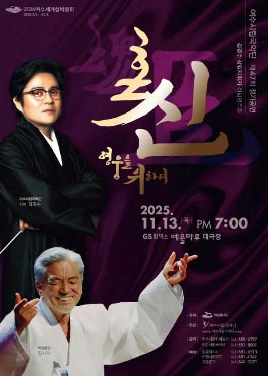 정기명 여수시장은 “이번 정기연주회는 전통과 현대가 어우러진 감동적인 무대가 될 것”이라며 “시민 여러분께서 국악의 깊은 울림 속에서 예술과 역사의 향기를 함께 느껴보시길 바란다”고 말했다.