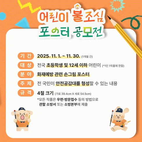 이번 공모전은 지역 내 초등학생이나 12세 이하 어린이를 대상으로 안전의식을 함양하고자 화재예방 메시지를 담은 4절 도화지(가로 39.4cm × 세로 54.5cm) 규격에 직접 그린 포스터 그림으로 1인 1작품만 제출할 수 있고 제출 기한은 이달 21일까지로 해남소방서 예방안전과를 직접 방문해 제출하거나 우편 접수도 가능하다.