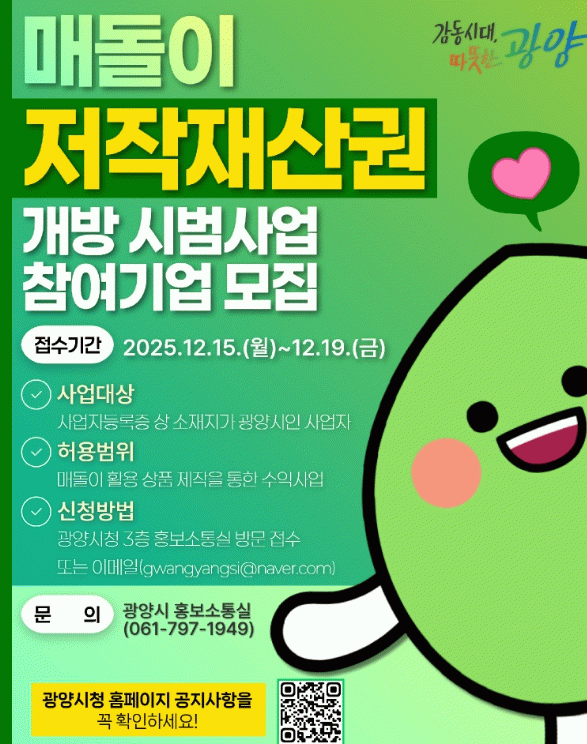 광양시 관계자는 “시민들에게 많은 사랑받아온 ‘매돌이’가 지역 기업의 손을 통해 다시 태어나 지역경제에 활력을 더하길 기대한다”며, “창의적 기획력과 실현 가능성을 갖춘 관내 기업의 많은 참여를 바란다”고 말했다.