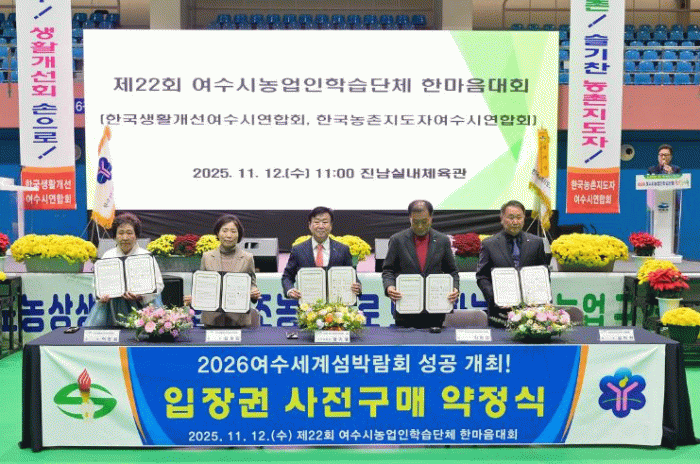 이날 행사에는 한국농촌지도자전라남도연합회와 한국생활개선전라남도연합회가 함께 참여해 총 4개 단체가 2,500만 원 규모의 2026여수세계섬박람회 입장권 구매 약정식을 진행하며 박람회 성공개최 염원에 뜻을 모았다.