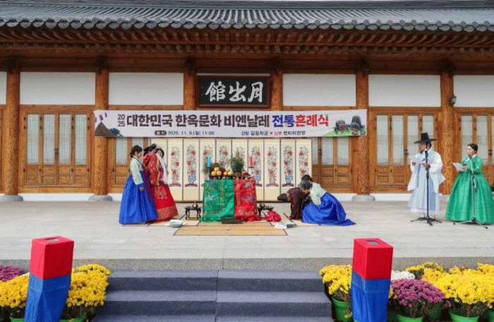 9일 영암목재문화체험장에서 ‘2025 대한민국 한옥문화 비엔날레’ 행사의 하나로 전통혼례식이 진행됐다.