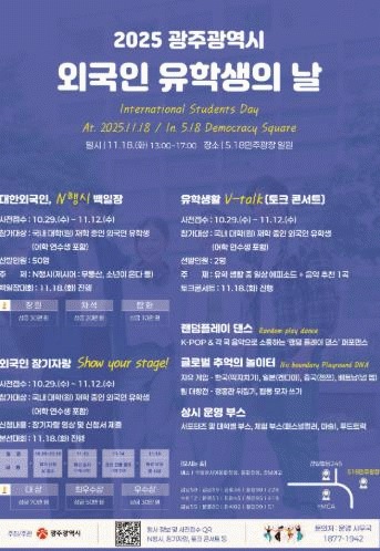 김기숙 교육청년국장은 “외국인 유학생의 날은 서로의 문화를 이해하고 존중하는 광주의 열린 마음을 보여주는 행사”라며 “광주가 세계 속의 교육·문화 교류 중심도시로 성장할 수 있도록 지속적인 지원과 교류의 장을 확대하겠다”고 말했다.