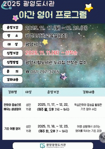 수강 신청은 오는 11월 17일 오전까지 광양시립도서관 누리집에서 가능하다.