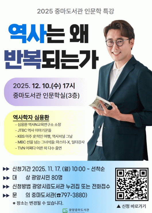 도서관은 이번 강의를 통해 역사의 반복 속에 담긴 인간과 사회의 본질을 되짚고, 오늘을 비추는 통찰을 시민들과 함께 나누며 올 한 해 이어진 인문학 여정을 의미 있게 마무리할 계획이다.