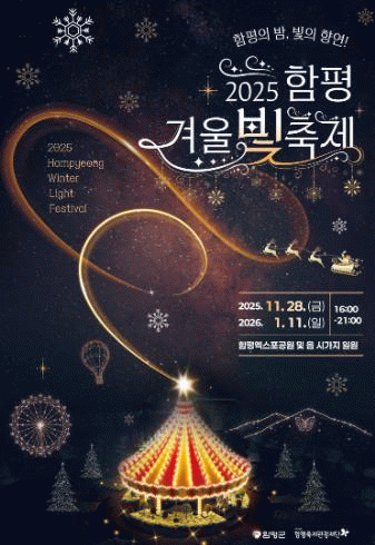 특히 올해 축제는 2025 대한민국 국향대전이 열렸던 축제장을 활용해 ▲이이남 작가의 대형 미디어아트 ‘빛으로 피어난 겨울, 함평의 인사’ 전시 ▲빛의 회전목마·미로정원, 천사 조형물 등 특색 있는 야간 경관조명 연출을 더해 빛과 예술이 결합된 ‘빛의 테마파크’를 선보일 예정이다.