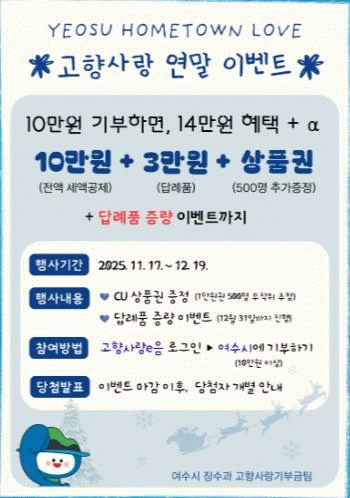 이번 이벤트는 12월 19일까지 고향사랑e음 누리집 또는 은행 앱을 통해 10만 원 이상 기부자 중 500명을 추첨해 편의점 상품권(1만 원권)을 증정한다.
