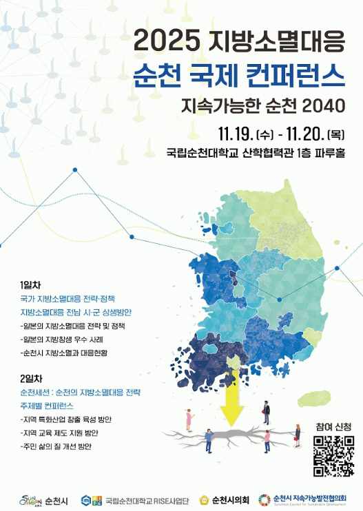순천시는 오는 19일과 20일 양일간 국립순천대학교 산학협력관 파루홀에서 '2025 지방소멸대응 순천 국제 컨퍼런스'를 개최한다.