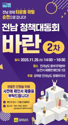 지난 9월 전남도청에서 개최했던 1차 행사처럼, 강위원 경제부지사와 정책 제안자가 직접 만나 정책 제안을 청취하고 의견을 나누는 열린 토론장으로 마련된다.