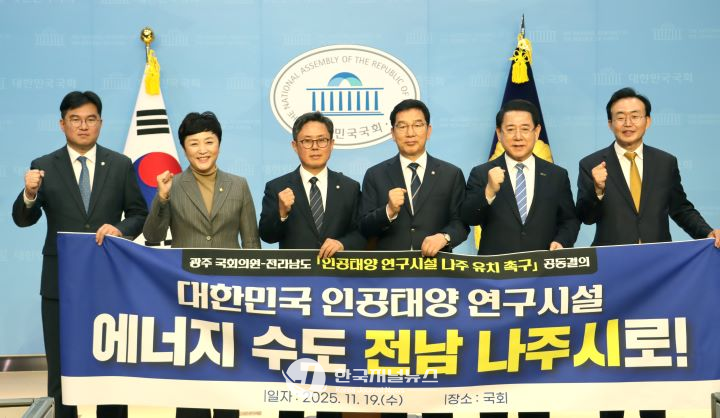 전남도는 이날 김영록 도지사, 김원이 민주당 전남도당위원장, 신정훈 국회 행정안전위원장, 박지원·이개호·조계원·김문수·권향엽 국회의원과 윤병태 나주시장 등이 참석한 가운데 국회 민주당 원내대표 회의실에서 ‘인공태양 연구시설 전남 나주 유치 전남 국회의원 공동결의문’을 발표했다. 오후에는 광주를 지역구로 둔 안도걸·전진숙·정준호 국회의원과 국회 소통관에서 공동결의문을 발표, 인공태양 연구시설 유치 노력에 힘을 실었다.