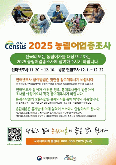 농림어업총조사는 국가데이터처에서 5년마다 실시하는 국가기본 통계조사로, 우리나라 농림어가의 전반적인 실태를 파악해 국가 정책 수립 기초자료로 활용된다.