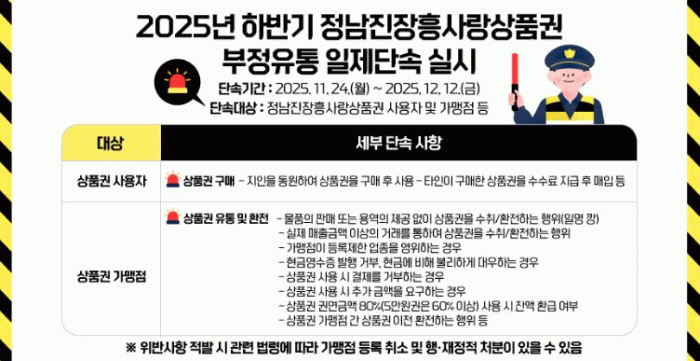이번 단속은 지역사랑상품권의 부정유통을 사전에 차단하고 건전한 유통질서 확립을 위해 추진된다.