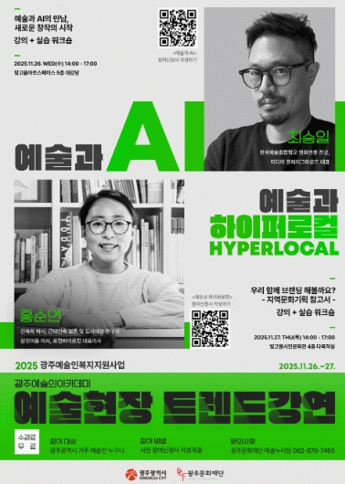 이번 과정은 광주광역시가 주최하고 광주문화재단이 주관하는 ‘2025 광주예술인복지지원사업’의 ‘광주예술인아카데미’ 과정 중 하나로, 예술활동과 최신 동향의 접목을 통해 지역 예술인의 역량강화를 지원하고자 기획됐다. 강연 주제는 예술인의 창작 기반 확장을 목표로 AI와 하이퍼로컬로 구성했다. 특히 하이퍼로컬은 ‘아주 좁은 생활권 단위의 연결과 특성’을 기반으로, 지역 내 공간ㆍ네트워크ㆍ주민과의 관계를 창작 활동과 연계하여 예술 활동의 실천 영역을 확장할 수 있는 개념으로 주목받고 있다.