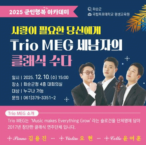 조미화 화순군 인구청년정책과장은 “2025년 한 해 동안 군민행복 아카데미에 함께해 주신 군민 여러분께 감사드린다”라며, “Trio MEG가 들려주는 따뜻한 음악과 이야기로 연말의 감동과 위로를 느끼시길 바란다”라고 말했다.