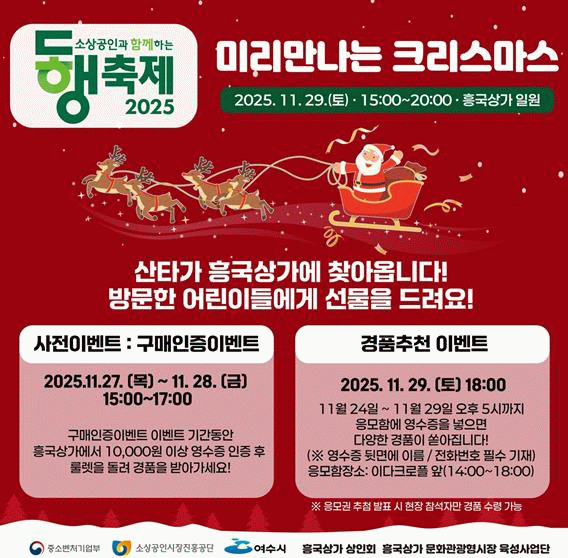 이번 행사는 크리스마스를 앞두고 흥국상가 방문객에게 산타와 기념사진 촬영, 버스킹 공연, 경품 이벤트 등 다양한 체험과 즐길 거리를 제공할 예정이다.