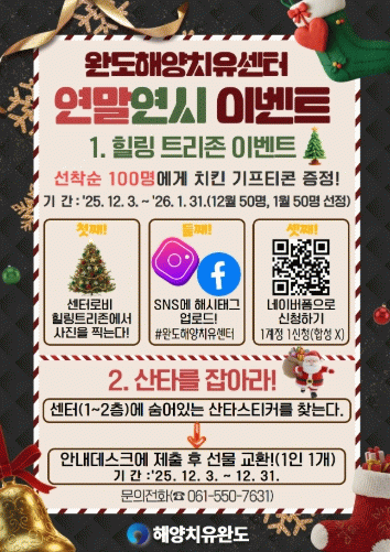참가 방법은 12월 1일부터 22일까지 네이버 폼을 통해 사전 신청해야 하며, 자세한 내용은 완도해양치유센터 누리집 공지 사항을 통해 확인할 수 있다.