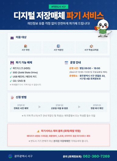 서비스 이용 대상은 주민등록상 주소지가 서구인 주민뿐만 아니라 서구 소재 회사·학교 등에 다니는 생활권자도 포함된다. 서비스를 희망하는 경우 서구청 회계정보과(062-360-7269)로 전화해 사전 예약 후 방문하면 된다. 단 배터리가 내장된 디지털 기기(스마트폰, 태블릿PC, 노트북 등)는 화재·폭발 위험으로 인해 파기 대상에서 제외되며 저장매체만 분리해 가져와야 한다.