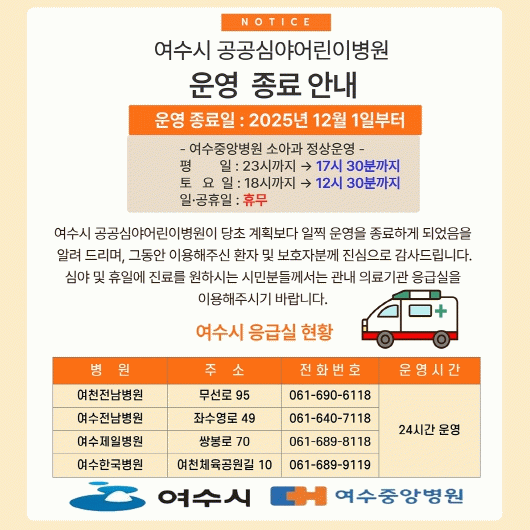 시 관계자는 “여수시 공공심야어린이병원은 지역 부모들이 가장 필요로 하는 필수 의료 서비스 중 하나였다”며 “이번 조기 종료는 병원의 요청으로 불가피하게 결정된 상황인 만큼 2026년에는 보다 안정된 체계로 재정비해 운영이 재개될 수 있도록 노력하겠다”고 밝혔다.