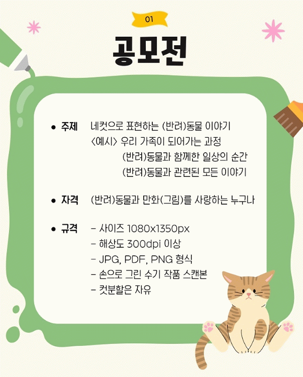 이번 공모전은 동물과 만화(그림)에 관심 있는 누구나 참여할 수 있으며, 반려동물과 일상에서 겪는 재미있고 따듯한 순간을 네컷만화로 표현하면 된다.