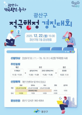 한편, 광산구 적극행정의 자세한 내용 확인 및 온라인 시민 투표 참여는 광산구 누리집(참여 · 소통→설문조사)에서 할 수 있다.