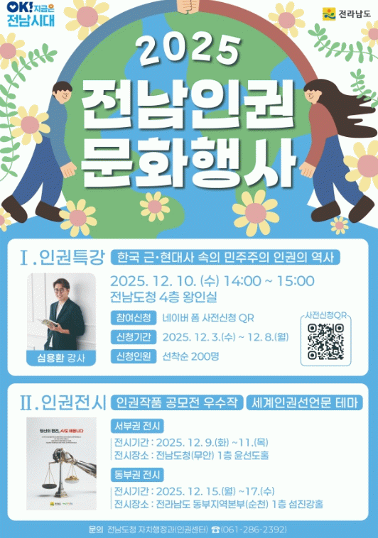 9일부터 11일까지는 전남도청 윤선도홀에서 ‘2025 전라남도 인권공모전 우수작’과 ‘세계인권선언문 테마’를 전시한다.