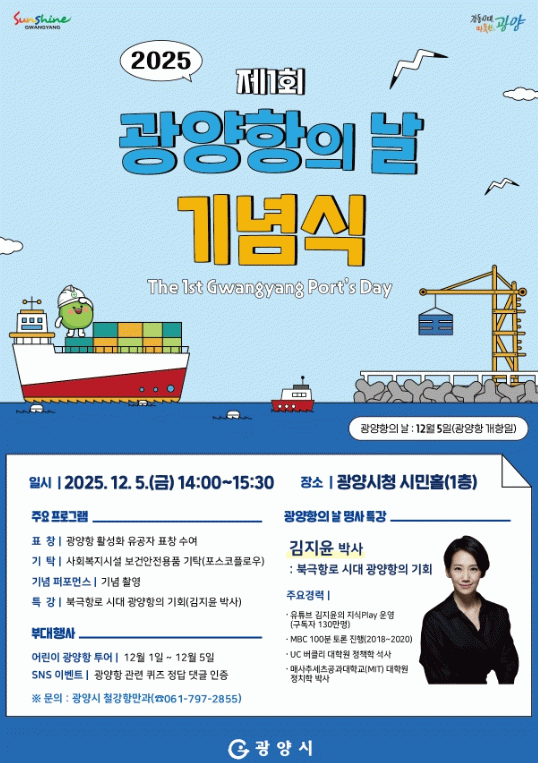 정승재 철강항만과장은 "올해 처음으로 열리는 '광양항의 날 기념식'은 광양항의 산업적‧경제적 위상을 공유하고 지역 사회와의 상생 협력을 굳건히 하는 의미가 있다"며 "포스코플로우와 같이 광양을 대표하는 기업이 지속적으로 사회공헌 사업을 이어가고 있는 데 깊히 감사드린다“고 혔다.