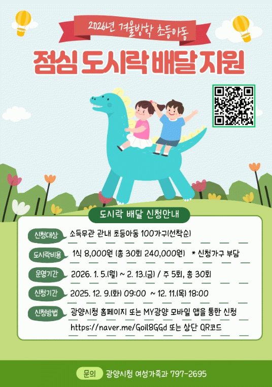 김영희 여성가족과장은 “겨울방학 동안 식사 해결이 어려운 아동이 집에서 안전하게 도시락을 받아볼 수 있도록 지원하는 것이 이번 사업의 핵심”이라며 “가정의 부담을 조금이나마 덜고, 아이들이 규칙적인 식생활을 유지할 수 있도록 마련한 만큼 많은 가정의 참여를 바란다”고 말했다.