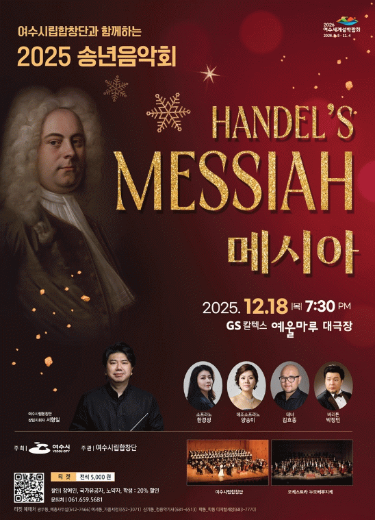 서형일 상임지휘자는 "메시아는 종교를 초월해 인간의 고난과 희망, 구원이라는 보편적 메시지를 담은 작품"이라며 "여수시립합창단의 정제되고 풍부한 사운드와 최정상급 솔리스트, 오케스트라가 만들어낼 감동의 하모니로 시민 여러분께 따뜻한 위로와 축복을 전하겠다"고 말했다.