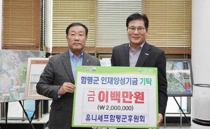 함평군은 5일 “유니세프함평군후원회가 지난 4일 군 인재양성기금에 200만 원을 기탁했다”고 밝혔다.