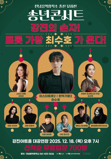 특히 하이라이트는 국악 크로스오버 버전으로 새롭게 편곡된 ‘강진군민의 노래’ 제창 순서. 익숙한 멜로디에 현대적인 감각을 더해, 600여 명의 관객이 한 목소리로 노래하며 2025년을 힘차게 마무리하고 희망찬 새해를 다짐하는 감동적인 순간이 연출될 것으로 기대되고 있다.