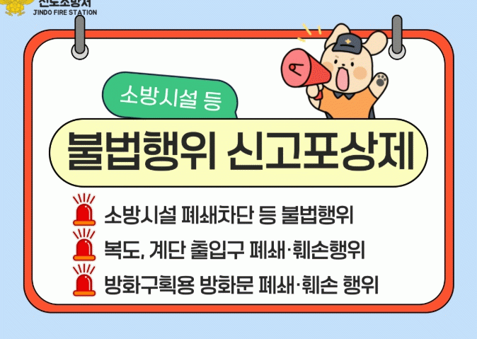 김재출 진도소방서장은 “비상구와 소방시설은 재난 상황에서 생명을 지키는 중요한 역할을 한다”며, “불법행위에 대한 자발적인 신고를 통해 안전문화가 일상에 자리 잡기를 기대한다”고 말했다.