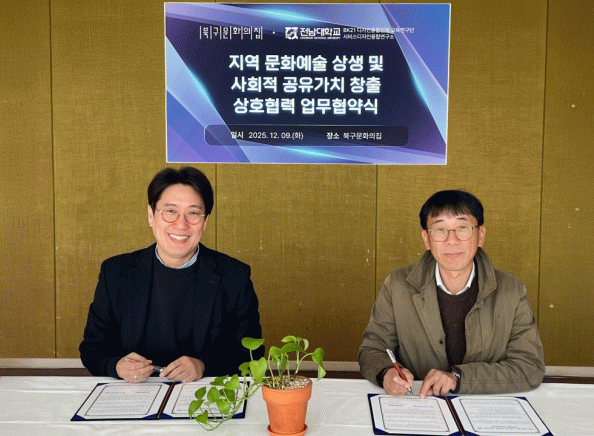 11일 전남대에 따르면, 전남대학교 BK21 휴먼케어 지능형 문화예술콘텐츠의 디자인융합인재양성 교육연구단(아트·디자인테크놀로지 협동과정)과 북구문화의집은 지난 9일 지역 문화예술 상생 및 사회적 공유가치 실현을 위한 업무협약(MOU)을 체결했다.