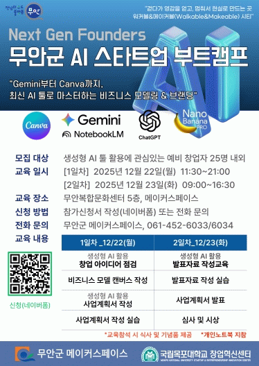 이번 부트캠프는 무안읍 메이커스페이스(일반랩)에서 예비 및 초기 창업자 25명을 대상으로 진행되며, ‘Gemini부터 Canva까지, 최신 AI 툴로 마스터하는 비즈니스 모델링 & 브랜딩’을 주제로 창업 아이디어 발굴부터 최종 사업계획서 작성, 모의 발표까지 실무 중심의 집중 교육이 이뤄질 예정이다.