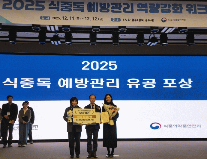 이번 수상은 식약처가 전국 17개 보건환경연구원을 대상으로 진행한 ‘식중독균 추적관리 사업’ 평가에서 식중독균 모니터링 검출률, 원인식품 규명률 등에서 종합적으로 우수한 성과를 낸 결과다.