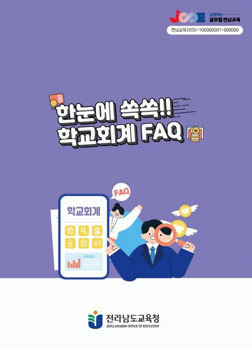 이번 FAQ 책자는 학교현장 교직원이 실무에서 가장 자주 묻는 내용을 중심으로 구성한 학교회계 실무 안내서로, 회계 전문용어를 저경력 교직원의 눈높이에 맞춰 쉽게 설명하고, 학교 현장에서 자주 접하는 회계처리 과정의 궁금증을 묻고 답하는 형식으로 구성해 이해도를 높이는 데 중점을 뒀다.