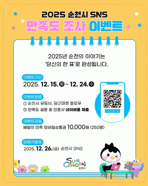 이번 행사는 시민들이 시정 소식을 보다 쉽고 재미있게 접할 수 있도록 운영 중인 순천시 공식 SNS 채널에 대해 만족도를 조사하고, SNS 참여형 이벤트를 통해 소통을 강화하기 위해 마련됐다.
