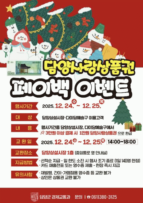 정철원 담양군수는 “연말 경기 침체 속에서도 지역 상권을 지키기 위해 다양한 소비 촉진 정책을 추진하고 있다”며 “이번 페이백 행사가 소상공인 매출 증대와 전통시장 이용 활성화로 이어지길 바란다”고 말했다.